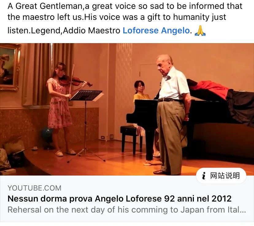 跨世纪伟大的意大利男高音歌唱家安杰洛.罗福雷塞(Angelo Lo Forese)于2020年5月14日离世,3月份才过完自己100岁生日。如今歌剧界的活化石离我们而去了。大师1920年3月27日出生于意大利米兰,18岁开始学习音乐,从男中音唱到男高音,一生演唱了无数歌剧角色,百岁歌唱家,前无古人后无来者。